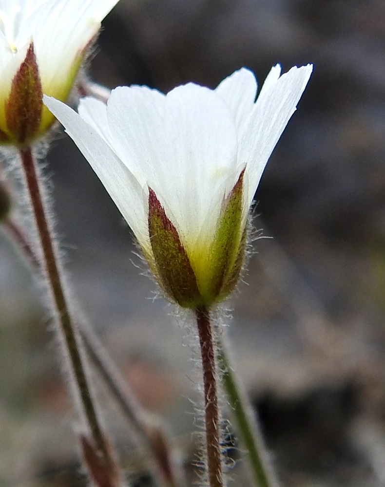 Cerastium alpinum subsp. alpinum – karvatunturihärkki vasemmalla ja C. alpinum subsp. lanatum – villatunturihärkki oikealla. Karvatunturihärkin kukkaperät ja verholehdet ovat tiheästi nysty- ja hapsikarvaiset. Kiharia villakarvoja niissä on yleensä vain vähän ja kuvan yksilössä vain muutama. Villatunturihärkin kukkaperä ja verholehdet ovat tiheästi kähärän villakarvaiset. Seassa voi olla jonkin verran nysty- ja hapsikarvoja. Kuvan yksilössä seassa on vain vähän hapsikarvoja. EnL, Enontekiö, Kilpisjärvi, Saana, 6.7. ja 5.7.2018. Copyright Hannu Kämäräinen.