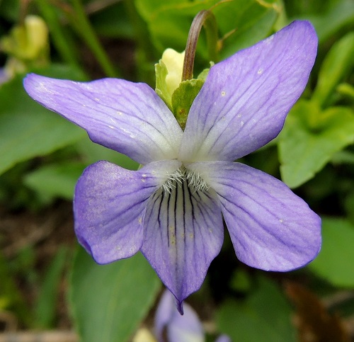 Rantaorvokin, Viola stagnina, kukka vasemmalla, rantaorvokin ja isoaho-orvokin risteymän kukka keskellä ja isoaho-orvokin, V. canina subsp. ruppii, kukka oikealla. EH, Vesilahti, Mantere, Peltosaari, Hulausjärven rantaan vievän peltotien ison laitaojan rinne, 6.6.2015. Copyright Hannu Kämäräinen.